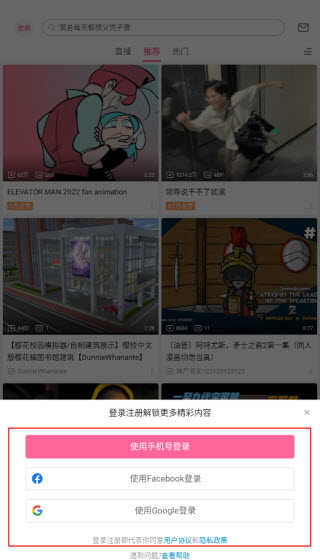 哔哩哔哩国际版账号登录支持手机号登录、facebook账号登录以及Google账号登录。只有使用手机号登录的时候才能同步该手机号下的国内b站账号。
