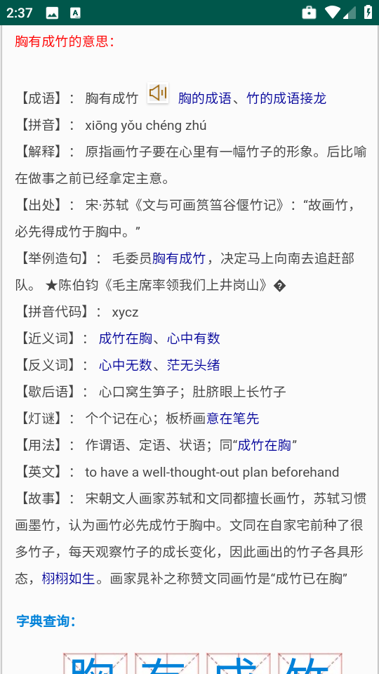 汉语大辞典是一款集成语、汉字、词语、诗词、灯谜、对联及近义词反义词别名等丰富内容的实用词典工具,适用范围广泛,一定程度上可以大大提高使用效率。这里汉语大辞典app中都有详细的介绍,包含怎么组词,怎么读,字或词的拼音是什么,以及字或词的出处全部包含在内,如此详解的解释,对于当今提笔忘字的当年青年有着非常大的帮助。