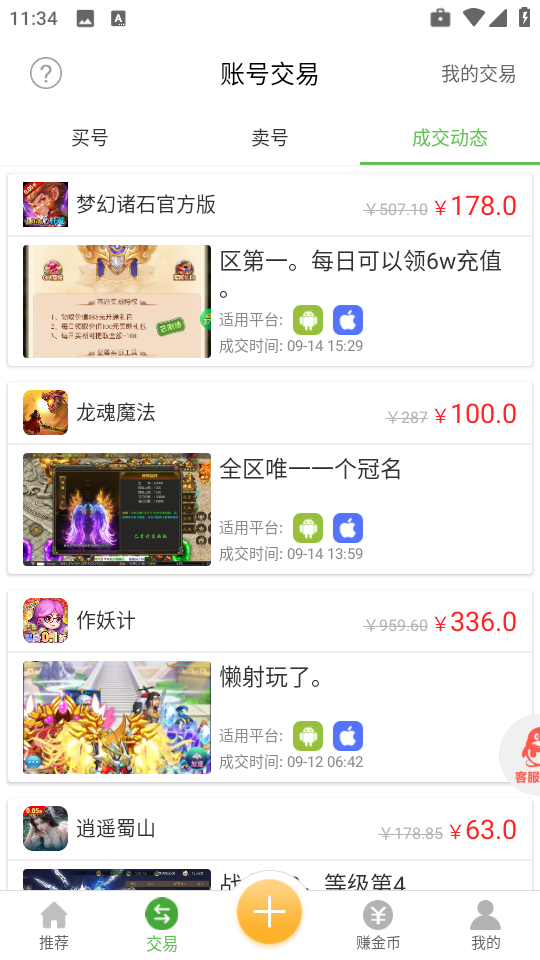 2、接着点击下方的“交易”,我们可以看到各种不同分类的游戏账号。
