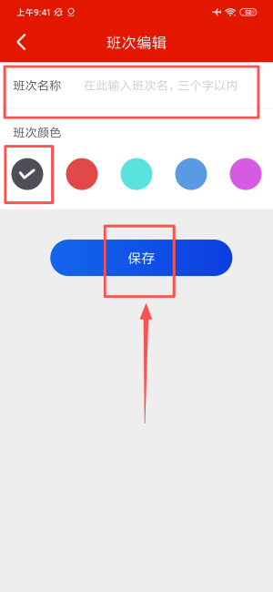 3、填写班次名称并选择标识颜色后,点击保存按钮即可完成新增操作。
