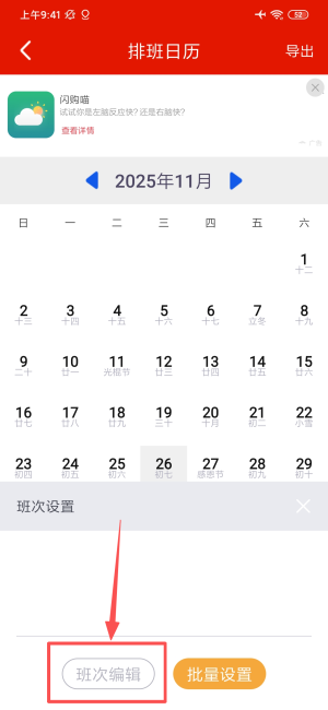 1、于排班日历页点击班次编辑功能键,进入班次管理设置界面。