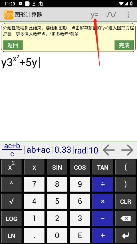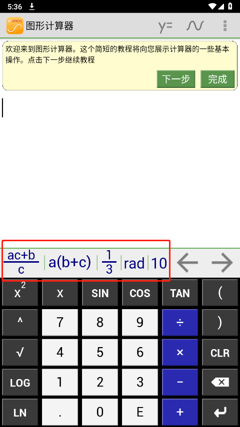 1、在本站免费下载安装几何方程计算器app,打开进入可以看到一个计算器似的屏幕,点击下面红色线圈住的式子可以出现简化的它门。
