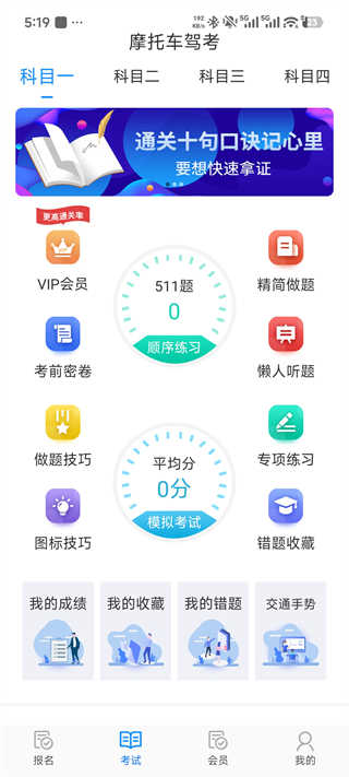 打开摩托车驾考App,点击考试板块,涵盖科目一至科目四的学习入口。提供VIP会员专享、精简做题、懒人听题等实用功能。此外,还有做题技巧、图标记忆技巧等辅助工具,帮助您高效学习。您还可以利用模拟考试和错题收藏功能,全面备考,提升考试通过率。