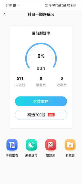在科目一的练习过程中,您可以查看刷题进度,选择继续做题或进行精选200题必做练习。软件还提供考前密卷和错题库等功能,帮助您针对性提升薄弱环节,确保临考前做好充足准备。