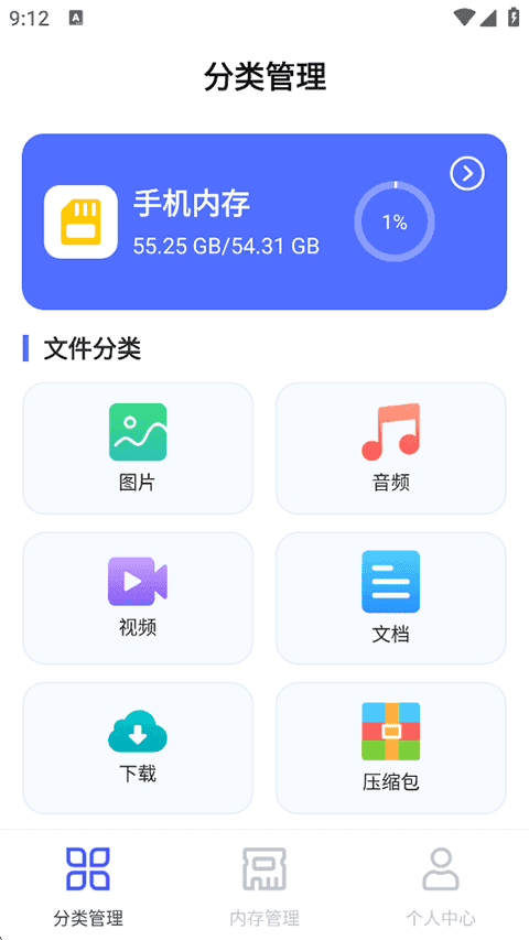 1、打开文件管理专家APP安卓版,在首页【分类管理】提供了图片、音频、视频、文档、下载及压缩包管理功能,以文档为例,点击进入;