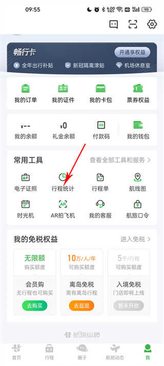2、来到我的页面之后,在中间的常用工具中找到行程统计,点击进入;