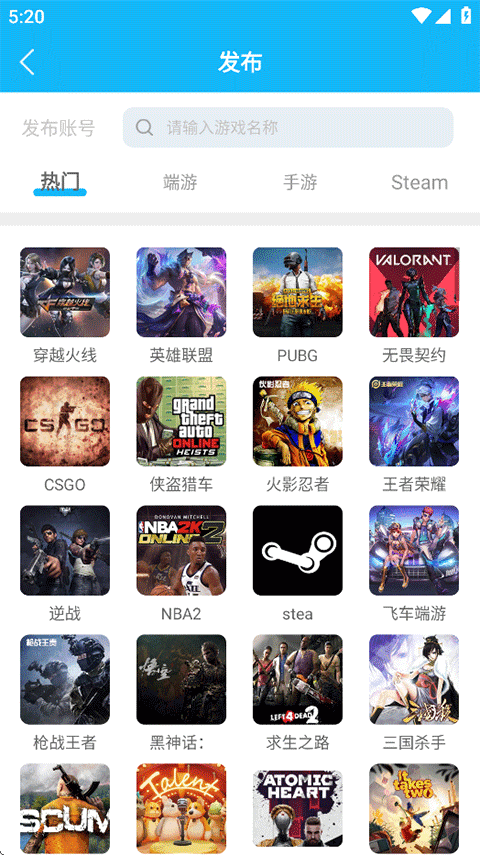 1、根据自己的需求,选择需要租号的游戏,以及游戏平台,例如手游、端游和Steam等平台。