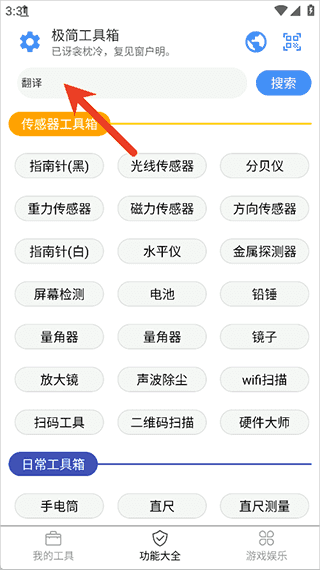 1、进入功能大全界面中可以通过搜索功能,将需要的功能搜索出来,例如搜索“翻译”