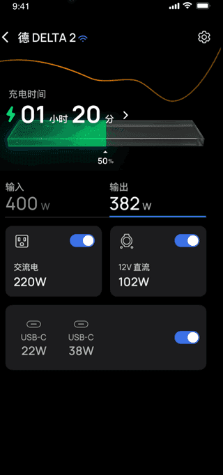 检查任何电源的输入功率,包括太阳能电池板和交流电源。除了全面了解您的输出功率外,还可以深入了解您的 EcoFlow 装置并查看每个端口的输出。