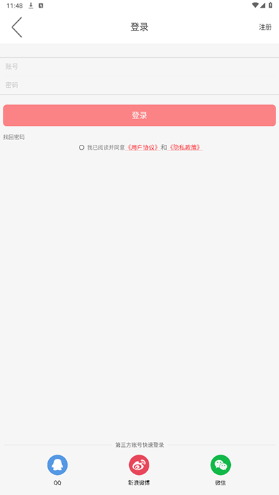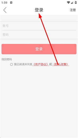 3、登录页面,可输入账号和密码登录,登录前需阅读并同意相关协议,忘记密码可找回,没有账号可进行注册。