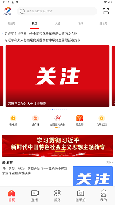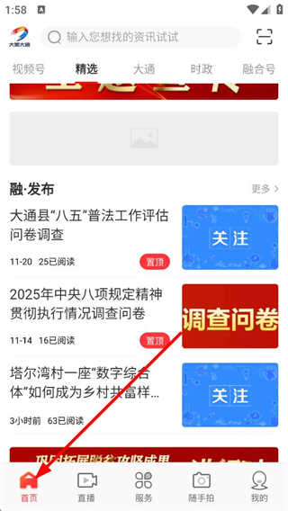 1、进入大通APP首页,可浏览精选、大通等多栏目资讯,参与融发布板块的问卷调查,了解本地时政和融合号内容。