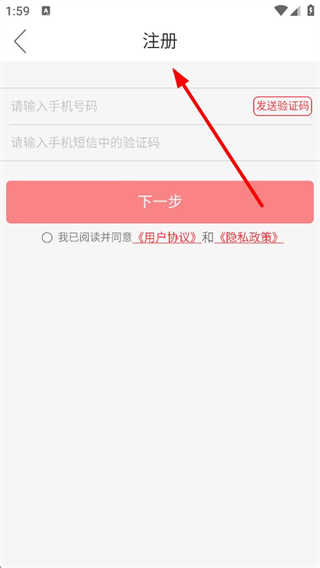 4、注册页面,输入手机号码获取验证码,阅读并同意相关协议后点击下一步,完成账号注册流程。