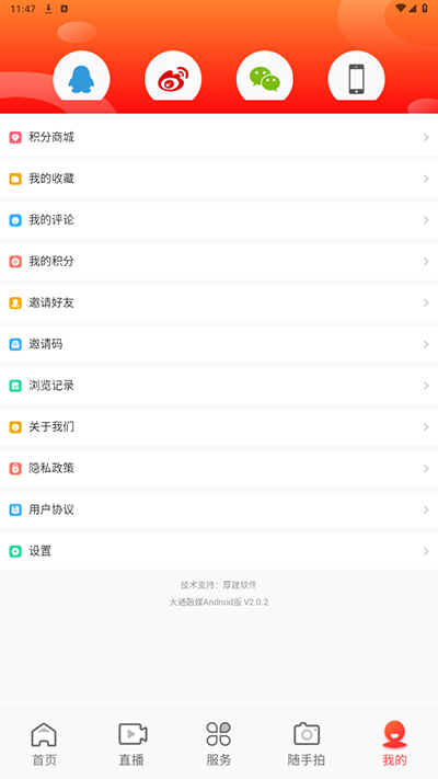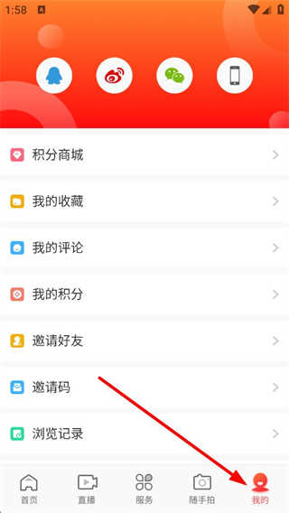2、点击底部我的按钮,进入个人页面,可进行登录,使用积分商城、我的收藏等功能,还能查看我的评论、积分和浏览记录,参与邀请好友活动。