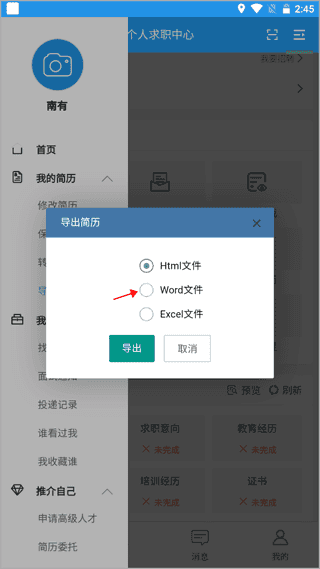 3、根据自己的需要选择相应的简历格式,选好点击“导出”按钮。