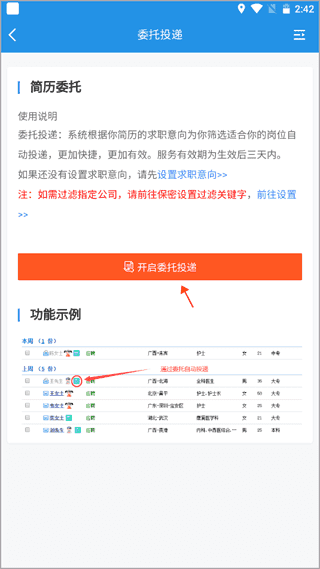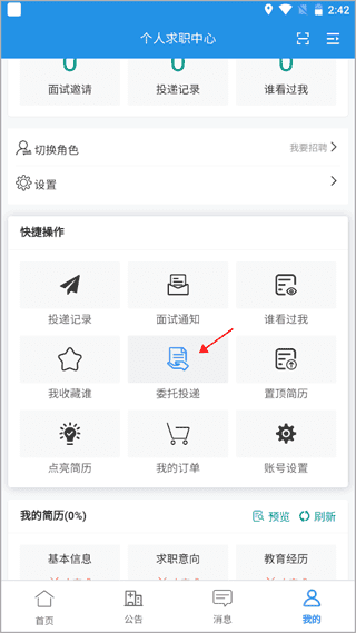 2、点击【委托投递】,不开启这个委托投递功能就不会自动投递简历了。