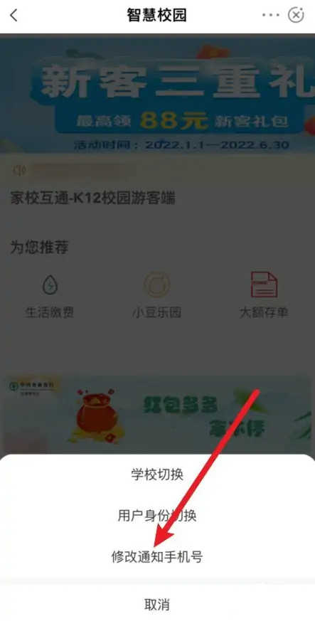 3、接着在底部弹出的选项中点击【修改通知手机号】
