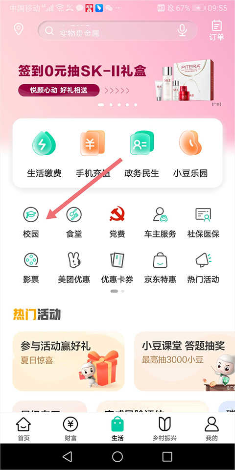 1、首先用户在手机上打开农行智慧校园app(即中国农业银行app),进入生活页面中点击【校园】
