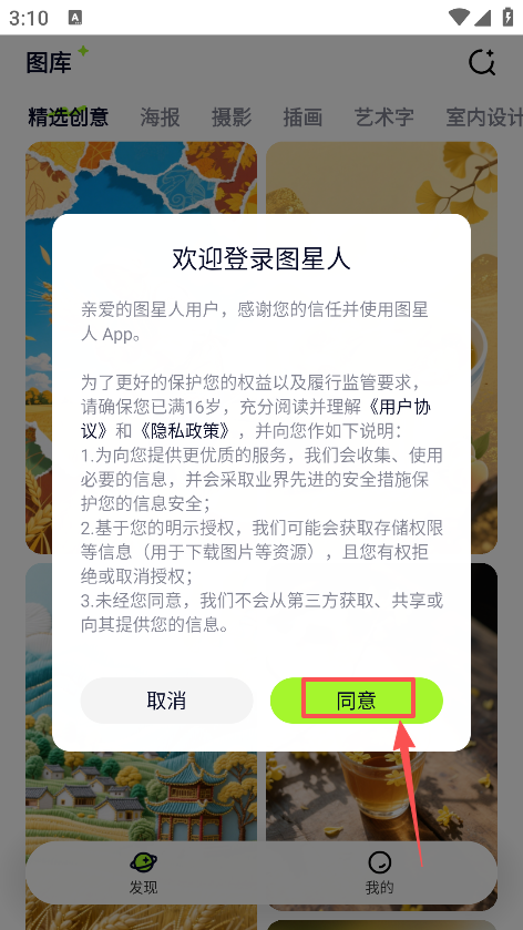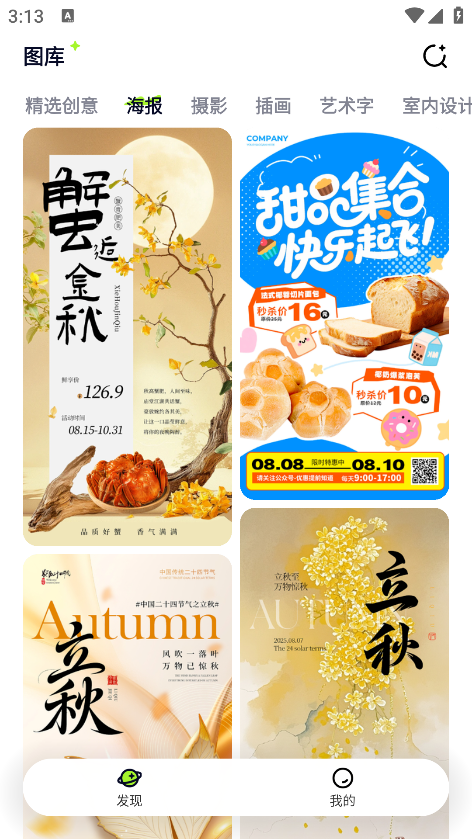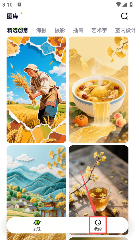 打开图星人App,进入「图库」或「搜索」页面,通过关键词(如“国风海报”“产品图”)筛选素材。