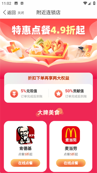 大牌餐饮特惠点餐 4.9 折起,下单额外享 5% 兑现值+50% 贡献值。