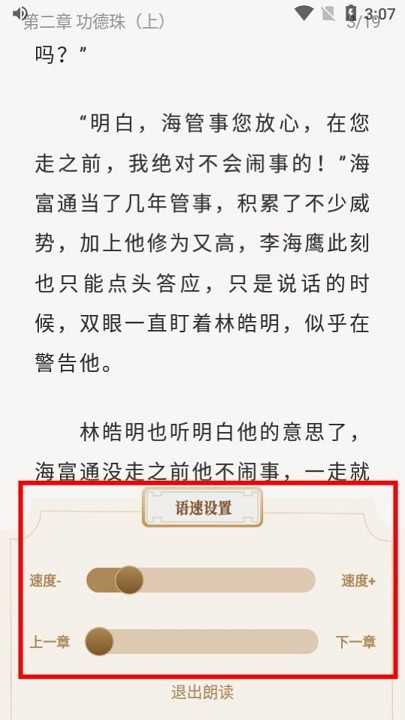 4、继续单击小说的文字界面,还提供了设置语速、调整章节、退出朗读等功能。