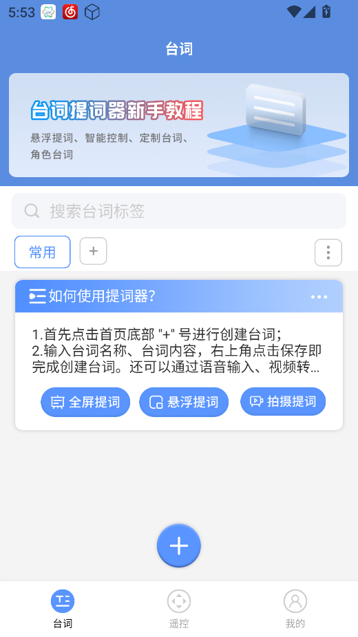 2、进入后台词页可进行全屏提词、悬浮提词、拍摄提词等,点击下方加号可添加台词。