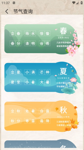 4、还提供查询节气等小工具,可了解春夏秋冬对应的节气及时间。