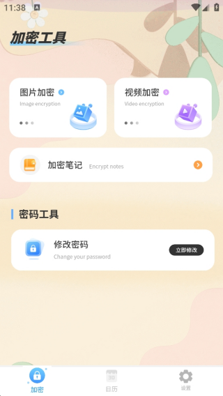 1、进入软件即可看到加密功能,可对图片、视频和笔记进行加密。