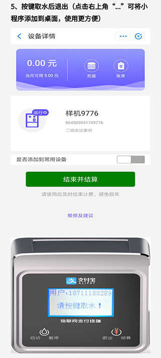 5、按键取水后点击机器上的退出按钮,或者在app上选择结束并结算。