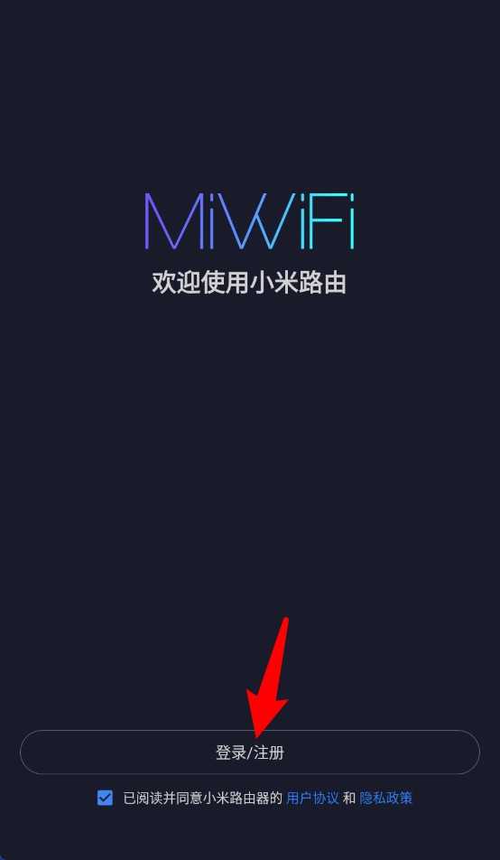 1、首次使用小米路由器需点击“登录/注册”按钮,同意用户协议与隐私政策后进入配置流程。