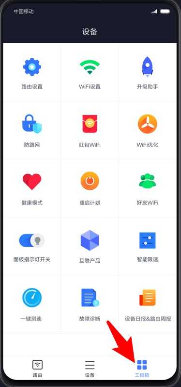 3、点击底部“工具箱”进入更多功能区域,可进行路由器设置、WiFi优化、重启计划等操作。