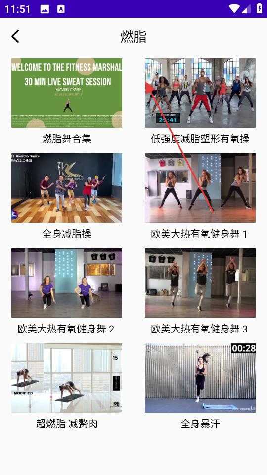 3、切换至燃脂分类,查看燃脂舞合集、全身减脂操等视频,选择喜欢的燃脂内容,点击播放,开展燃脂健身训练。