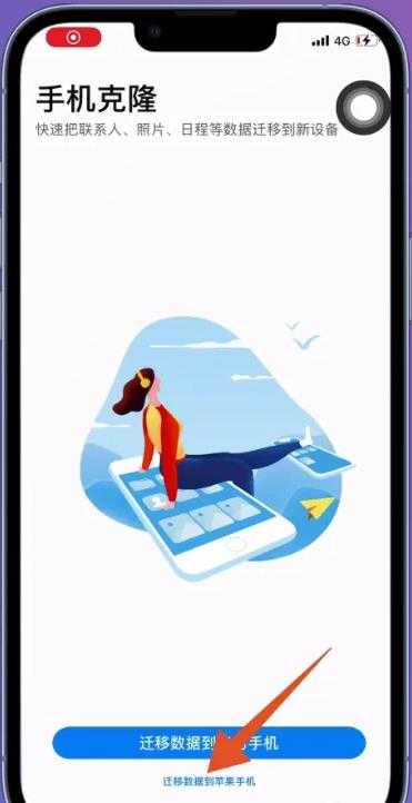 苹果手机下载打开华为手机克隆应用,点击底部位置的【迁移数据到苹果手机】。