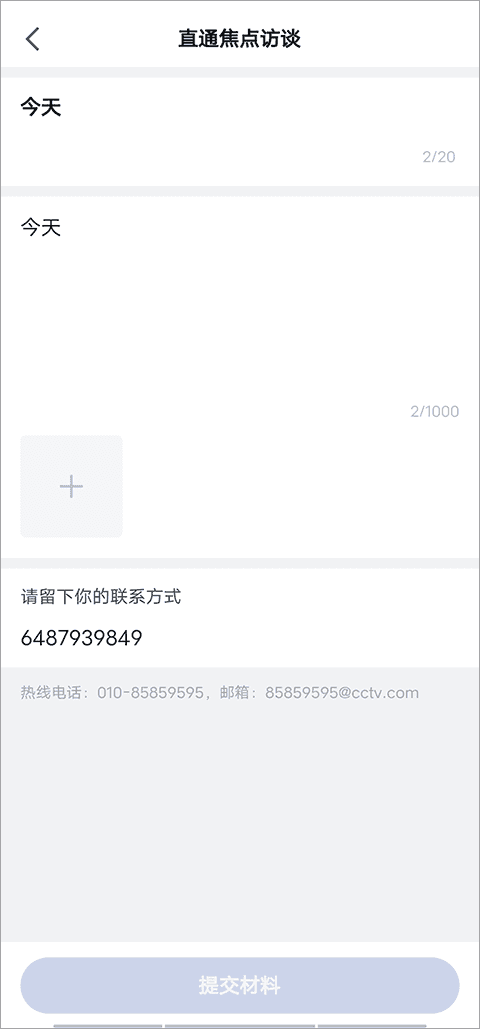 2、进到投稿界面后,输入标题、内容、还可以添加相关图片,以及你的联系电话后,点击提交材料即可投稿啦。