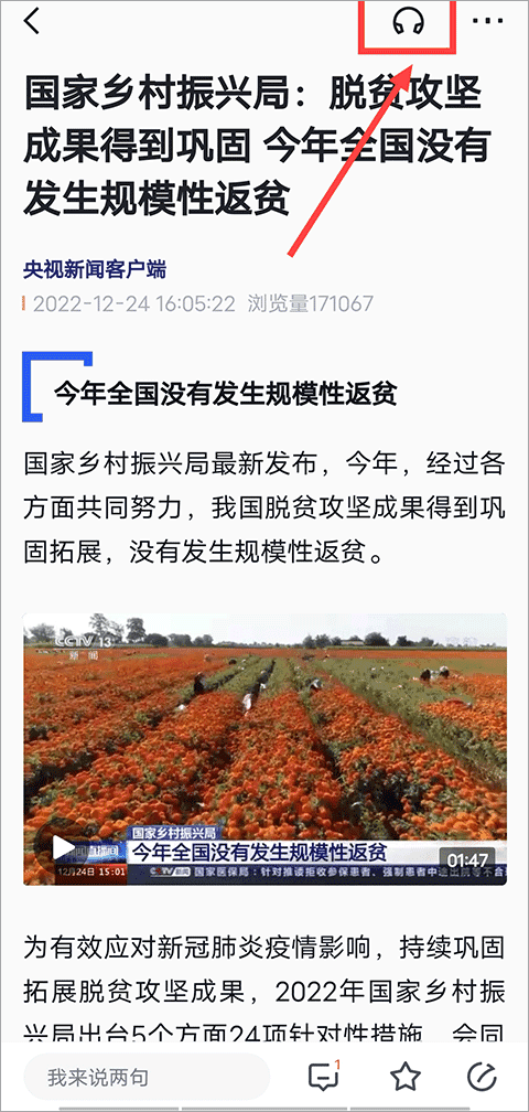 2、进到新闻阅读界面后,点击右上角的“耳机”图标。