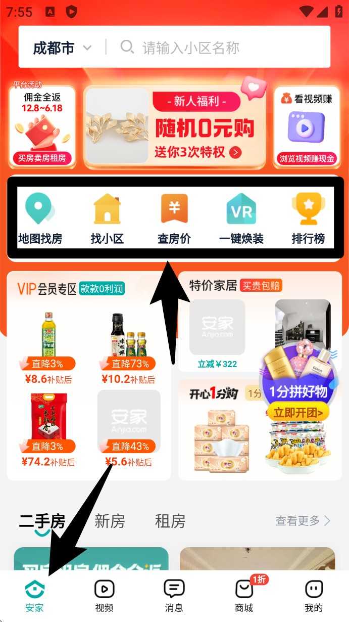 降价房源、租房、二手房、新房、地铁房、VR看房、房屋装修、省钱购物、购物返利、生活服务、社区团长