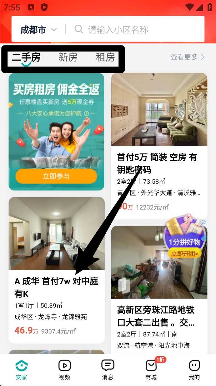 2. 切换上方分类标签选择「二手房」,下滑查看推荐房源,点击任意卡片可进入房源详情页面。