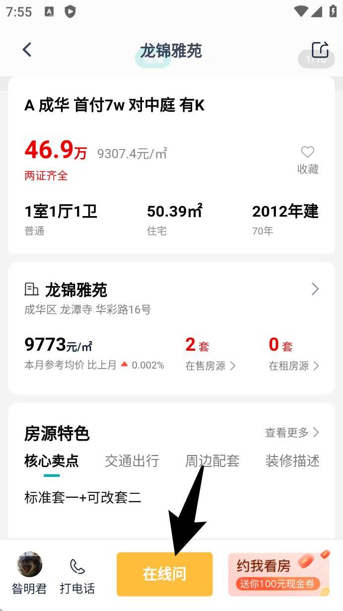 3. 在房源详情页可查看价格、面积、建成年份等信息,点击底部「在线问」可快速联系平台顾问。
