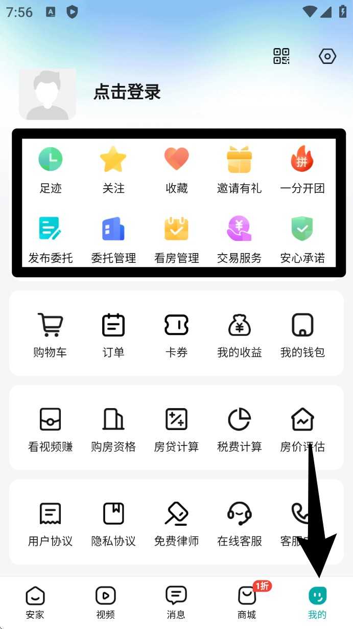 1. 打开首页后,点击底部「安家」页签,在上方可快速进入地图找房、查房价、找小区等功能模块入口。