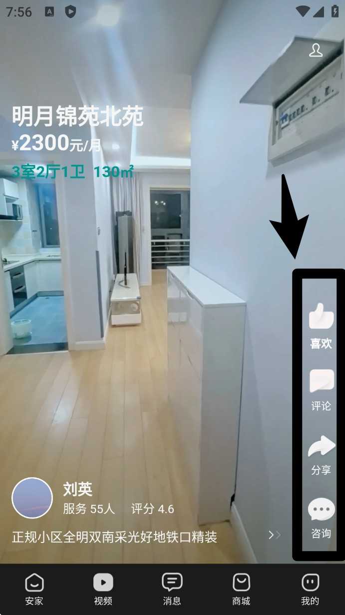 4. 若在看房视频中有感兴趣房源,可透过右侧菜单栏点赞、评论或点击「咨询」直接与服务人员联系。