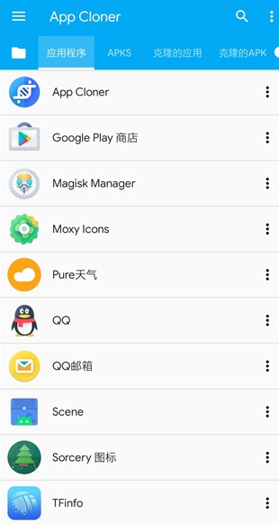 1、用户进入应用界面后会列出用户手机上所有已安装的应用APP,用户选择一个需要克隆的app点击