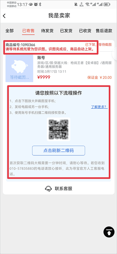 7、最后在已寄售界面内按照提示操作,并等待系统托管客服为您识图,识图完成后商品会自动上架。