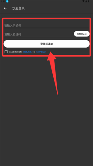 2、在登录页输入手机号获取验证码,勾选协议后完成登录。