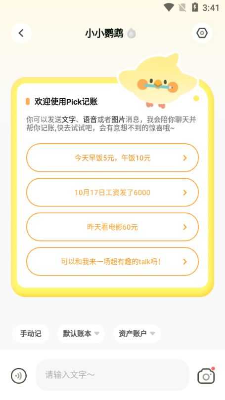 1、初次开启Pick记账时,使用者可与可爱的“小鹦鹉助手”展开交流互动,由此开启独属于自身的记账之旅。