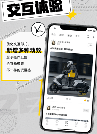 ZEEHO电动车是一款服务于Zeeho电摩车主的一款智能软件,是一款专门给该品牌高端电动摩托车用户推出的在线工具,用于车辆远程控制和行程状态查看,让用户们能够轻松享受便捷移动操作方式,解锁出行体验方式。通过这款软件,你可以实时获取电摩信息,实现人车全天候连接,结识同地区的摩托车朋友。用户可以通过社区分享精彩生活,让生活变得更加有趣。