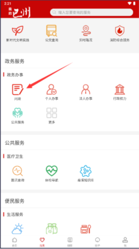 一、打开“我的巴州”手机APP,点击上方【问政】图标。