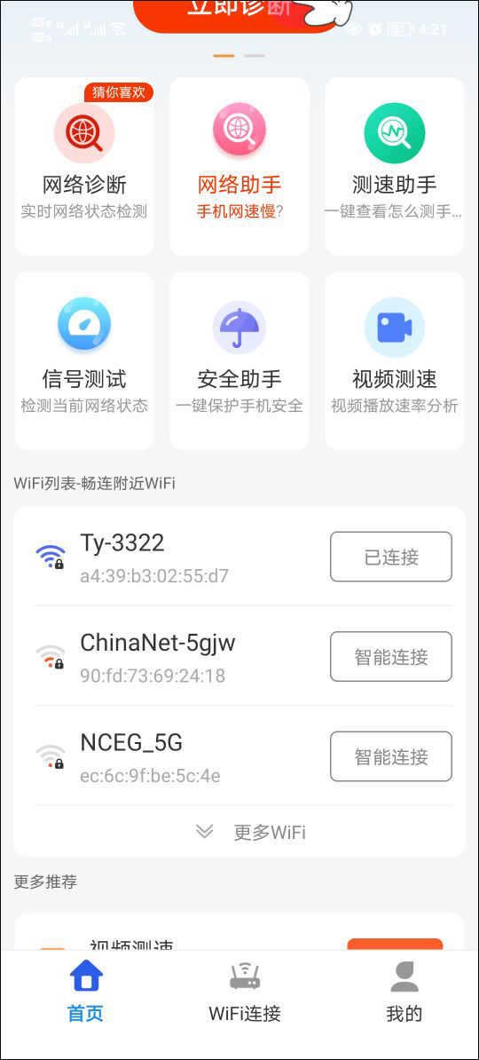 WiFi万能高手是一款功能全面、操作简便的wifi连接与管理软件。通过一键连接和智能识别功能,用户能够快速连接到最优质的wifi网络,享受稳定、快速的网络连接。软件还提供多种附加功能,如网络测速、网络诊断、垃圾清理等,帮助用户更好地管理和优化自己的网络环境。用户随时可以利用这个软件来优化自己的网络运行,让自己上网更加的方便,也可以随时设置上网速度,让蹭网的人无计可施,保证自己的上网需求。它不仅可以实时监测手机的网络状况,还能提供详细的数据分析,让用户全面了解网络的使用情况。借助精准的测速功能,用户能够轻松获取网络速度,优化上网体验。这款软件操作简单,界面友好,对于想要提升网络质量的用户来说,绝对是个不错的选择,能够帮助用户更加高效地管理网络。