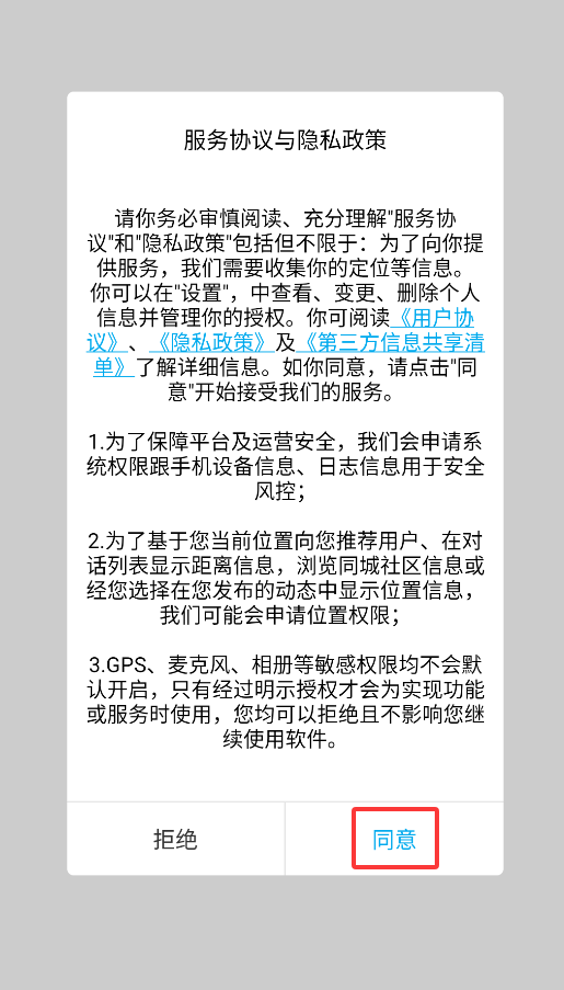 1、首次打开纯悦APP时,系统会弹出用户协议窗口,点击"同意"按钮后进入登录页面。