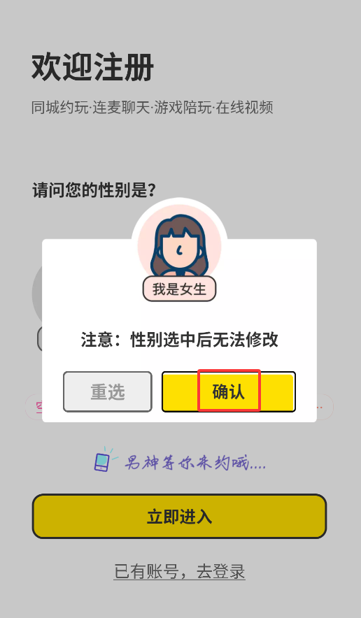 3、注册时需要选择性别(请谨慎选择,该信息确认后不可更改)。