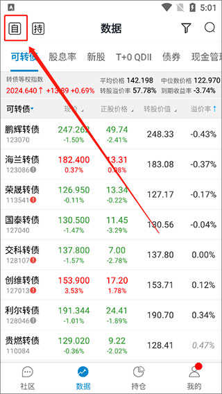 第二、当把所有自己持有的可转债都添加自选之后。回到可转债的页面,点击左上角的“自”这个按钮。就可以筛选出所有的自选可转债了。