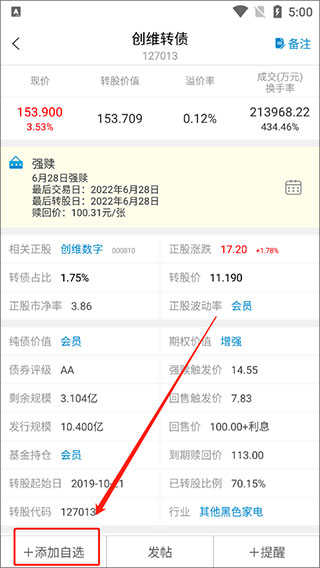 打开某只转债之后,点击左下角添加自选按钮,加入自选。